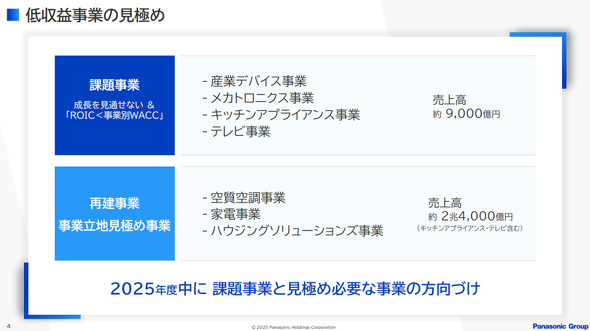 収益改善に取り組む中で低収益事業についての見極めを進める。パナソニックHDは事業についてROIC(投下資本利益率)と事業別WACC(加重平均資本コスト)による管理を進める方針を定めており、「課題事業」については「成長を見通せない」ということと「ROIC<事業別WACC」という2点を条件としている。その条件で課題事業となっているのが「産業デバイス事業」「メカトロニクス事業」「キッチンアプライアンス事業」「テレビ事業」の4事業だ。