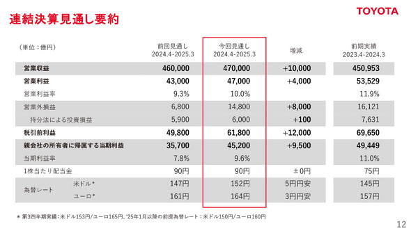 2024年度(2025年3月期)通期の業績見通しは、売上高が前年度比4.2%増の47兆円、営業利益が同12.2%減の4兆7000億円、当期純利益が同8.6%減の4兆5200億円を見込んでいる。