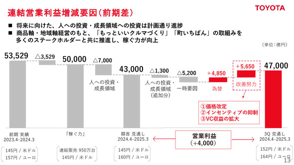 営業利益は前回の予想から4000億円増に上方修正した。価格改定や販売奨励金(インセンティブ)の抑制、バリューチェーン収益の拡大など5650億円の原価改善を計画している他、為替レートの影響が4850億円のプラスになる見込みだ。人や成長領域への投資は合計で8300億円となり、計画通り実施するとしている。