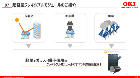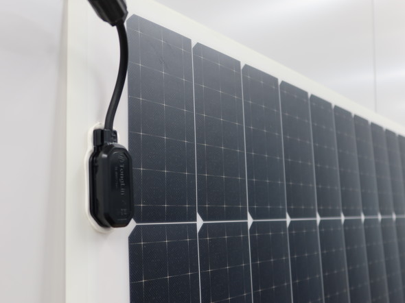 太陽光パネルは中国のサンポートパワー製だ。ガラス系の太陽光パネルと同等の発電効率を持つ。ガラスを使わないため反射率は10分の1以下で、近隣への太陽光の反射を抑制できる。また、ガラス不使用のため太陽光パネルの同一面積当たりの重さは4分の1と軽量で、屋上などの耐荷重の課題がクリアしやすい。太陽光パネルが割れた場合は上から新しいパネルを重ね貼りすることで使用を継続できるという。