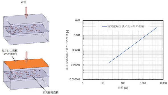 自作PCを製作する際、CPUとヒートシンクの間に熱伝導グリスを塗ります。なぜ必要なのでしょうか。トライボロジーの文献には「真実接触面積」というパラメーターがあります。機械加工部品やCPU表面には「表面粗さ」という凹凸があります。数μmかそれ以下の値ですが、固体同士は凸部だけ接触しています。図7に接触状態の模式図を示します。
