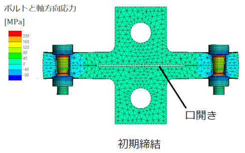連載「CAEを正しく使い疲労強度計算と有機的につなげる」の第18回「フリーソフトでボルトの疲労破断の有無を予測する」の中で、初期締結状態の接触状態を示しました。これを図9に再掲します。図のように口開きが発生しています。口開きのところの真実接触面積はゼロです。ボルト締結に頼っても接触面積はあまり増えません。