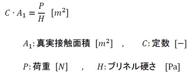 ブリネル硬さは荷重/面積だったので、荷重をブリネル硬さで割った量はつぶれて接触した面積ですね。つぶれて接触した面積は真実接触面積ととても関係があると考えられます。次式を仮定しましょう(式8)。