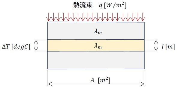 図11のようなモデルを考えます。2つの固体の間にもう1つの固体があって、それらはロウ付けで固着しているとします。ロウ付けなので真実接触面積と見かけの面積は等しくなります。また、中間の固体の熱伝導率をλmとします。図11のモデルが図10のモデルと全く同じ熱的挙動をする条件での中間の固体の厚さlを求めましょう。
