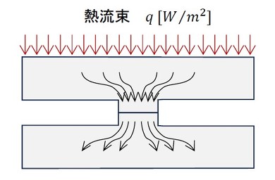 図10において、熱流束は真実接触部の方が空気による量よりはるかに大きそうですね。ということは、図12に示すように熱流束の集中があります。フーリエの法則から「熱流束の大きいところは温度差大」となります。また、トライボロジーの観点から金属表面には汚れ、吸着分子、酸化膜などがあり、金属原子が露出していることはあり得ません。真実接触部には熱流束の集中と金属原子が露出していないことから、温度差は見積もりよりも大きくなると考えられます。その補正をします。