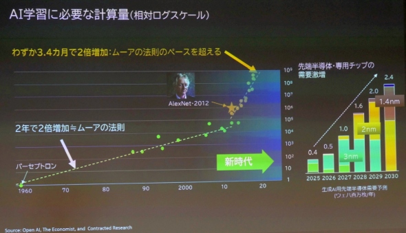小池氏は「かつて半導体の性能向上はムーアの法則で示される通り2年で2倍のペースだった。しかし、2012年の発表されたAlexNetなどのAIの登場によって、AIの計算処理に求められる半導体の性能は3〜4カ月で2倍となり、ムーアの法則を超えるようになっている。これによってAIチップの需要が急増しており、半導体製造プロセスも3nmや2nm、1.4nmなどに急速にシフトしつつある」と語る。