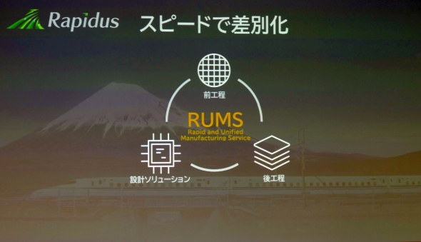 この先端半導体製造プロセスにおいて、Rapidusが差別化のポイントとするのが「スピード」だ。ウエハー上に回路を作り込む前工程と、ウエハーから切り分けたチップを組み合わせてパッケージングする後工程、そして半導体の回路設計に関するソリューションを相互に連携させる「RUMS(Rapid and Unified Manufacturing Service)」モデルを構築しており、「RUMSにより最適な専用チップを最速で顧客に届ける」(小池氏)という。