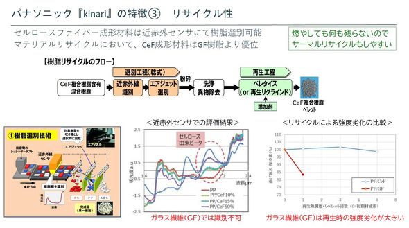 kinariのリサイクルプロセスの手順は以下の通りだ。まず近赤外線識別により混合プラスチックにおけるkinariを識別し、エアジェットで選別して、粉砕する。次に、洗浄を行い、添加物を加えてペレタイズし、CeFプラスチックペレットとして再生する。「GFプラスチックは近赤外線センサー樹脂選別できないが、CeFプラスチックは対応する。そのため、CeFプラスチックはGFプラスチックよりマテリアルリサイクルしやすい」(名木野氏)。