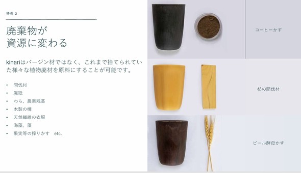 さらに、kinariは石油由来のプラスチック用の成形機に対応する他、試作段階に外部機関でのテストにより9カ月で生分解できることが証明されている。同社は現在、つなぎ樹脂も含めて100%生分解可能になるように開発を進めている。