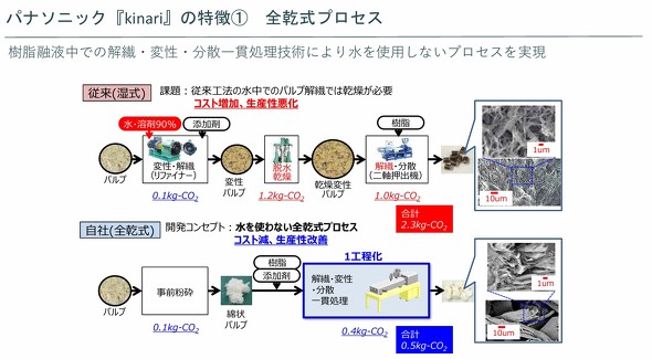 kinariの製造プロセスは以下の通り。まずパルプなどを事前に粉砕し綿状パルプを作る。綿状パルプに樹脂や添加剤を加えた後、樹脂融液中で解繊、変性、分散の一貫処理を行いペレットを製造する。このように製造プロセスは全工程にわたり水を使用しない全乾式で、湿式の製造プロセスと比べてCO2排出量を削減している。
