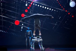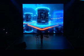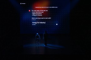 「ことしの展示会のテーマについて、将来のビジョンを生成して」とプロンプトを入力すると、AIチャットbotがそのイメージを展開していく様子が示された[クリックで拡大] 出所:ドイツメッセの動画をキャプチャーこのほか人型ロボットや2輪ロボット、4足ロボット、さらに飛行する昆虫型ロボットとともに舞台上に上がったダンサーが踊る演出があったほか、演台も実際の多関節ロボットが支えるなど、世界最大級の産業見本市らしい、趣向を凝らしたものとなっていた。