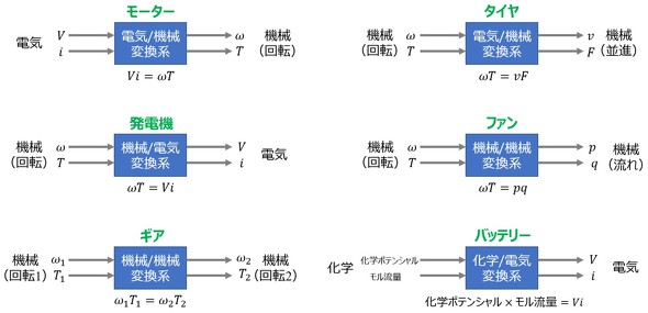 図4に各種要素について、入力と出力を示す。すなわち、モーターは電気を機械に変換、発電機は機械を電気に変換、ギア(減速機、増速機)は回転数とトルクを変換、タイヤは回転を直進に変換、ファン(ポンプ)は機械エネルギーを流れのエネルギーに変換、バッテリーは化学を電気に変換する要素である。
