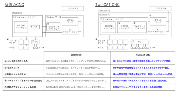 このPCベースCNCを用いることにより、工作機械メーカーは自由度の高い機能開発が可能となる。これを従来までのCNCとの比較で示したのが図10である。