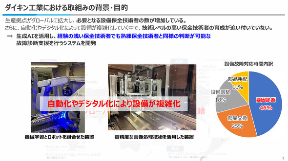 製造現場では、人手不足が進む中で自動化が進んでいる。その中で画像の活用など設備の高度化が進んでおり、設備保全に求められる知識や経験はより広く、深いものが必要となっている。一方で、ダイキンの生産拠点がグローバルに広がる中で、技術レベルの高い保全技術者の育成が追い付いておらず、これらを支援する仕組みが必要となっていた。
