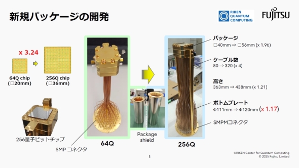![36mm角の256量子ビットチップ(左)と、2023年に開発した20mm角の64量子ビットチップ(右)。2×2の4量子ビットで構成されたユニットセルを単位に、スケーラブルにレイアウトされている[クリックで拡大] 撮影:関行宏](https://image.itmedia.co.jp/mn/articles/2504/28/sp_250428fujitsu_riken_05.jpg)