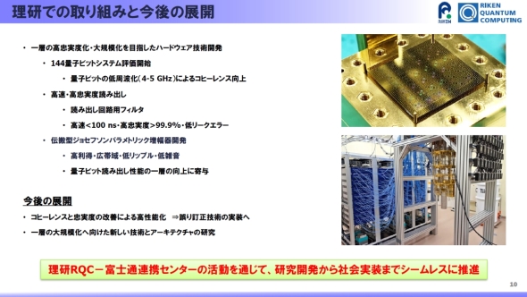 今後の展開としては、2021年4月1日に理研内に発足した理研RQC-富士通連携センターの活動をさらに4年間延長し、1000量子ビット級あるいはそれ以上の超伝導量子コンピュータの実現を共同で目指していく考えだ。