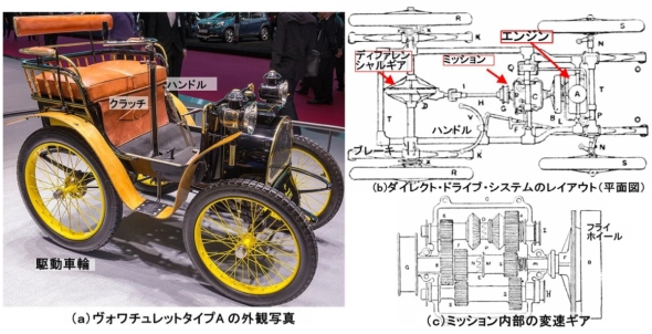 ※18)1898年にフランスの技術者のルイ・ルノー(Louis Renault、1877〜1944年)とその兄弟が「ルノー・フレール(ルノー兄弟)」社を設立。プロペラシャフト式フロントエンジンリアドライブ(FR)方式の原型である斬新な機構「ダイレクトドライブシステム」を発明。トップは直結のダイレクトドライブでリバースギアも内蔵し、3段ギアボックスで最適な速度を変えられ、ベベルギアによって車軸に動力を伝える。ルイ・ルノーは1899年にフランス特許取得。この機構を搭載した小型自動車「ヴォワチュレットタイプA(Voiturette)」を市販し、商業的成功を収めた。1904年、フランス国内に120店舗の販売代理店網を構え、事業基盤を固めた。英国やドイツ、日本など諸外国への輸出も行い、ロシアに工場を建設した。