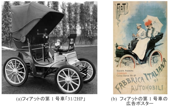 自動車関連では同年2月、フランスのルノー※18)が設立された。図13に、1898年にルノーが初めて製作した4輪自動車「ヴォワチュレット タイプA」を示す。6月にはイタリアのフィアット※19)が設立された。図14に、1899年にフィアットが初めて製作した第1号車「3 1/2HP」とその広告ポスターを示す。