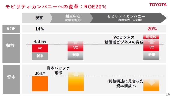トヨタ自動車は「モビリティカンパニー」への移行を目指している。新車販売を中心とするアセットビジネスだけでなく、バリューチェーンビジネスの拡大や新領域ビジネスを拡大することで、収益変動に備えるための資本を削減できるようになれば、ROEを現在の2倍の20%にすることも可能になる。トヨタ自動車として、モビリティカンパニーへの移行について明確な指標は設けていないものの、ROE20%の達成は事業構造/資本構成の変革の進捗を測る“モノサシ”になるとしている。