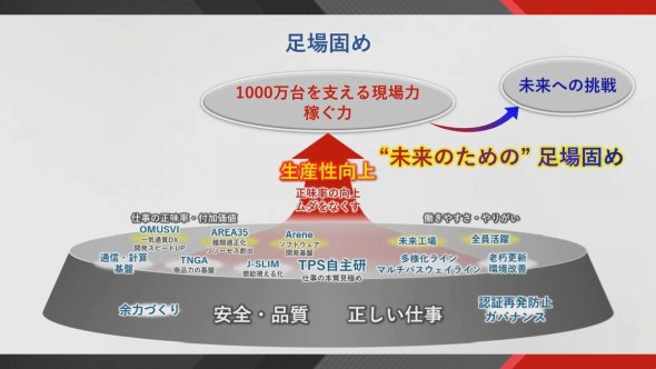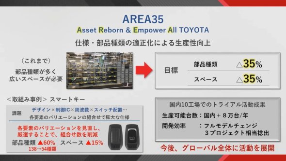 開発活動の生産性向上では、仕様や部品の種類を適正化する「AREA35」を国内10工場でトライアル実施することによって、フルモデルチェンジ3プロジェクト分の開発効率化につなげたという。今後はグローバルで活動を広げていく方針だ。