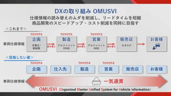 また、車両仕様情報を企画開発、製造、営業の間で人手で読み替えていた作業を、デジタル化によって一気通貫でつなぎリードタイム削減につなげる仕組みである「OMUSVI」の整備も進めている。