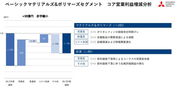 ベーシックマテリアルズ&ポリマーズセグメントの売上高は同12%減の9724億円で、コア営業利益は156億円の減益となった。同セグメントのコア営業利益は、炭素事業を中心に在庫評価損益が悪化したものの、ポリオレフィンなどにおいて原料と製品の価格差が拡大したことなどにより改善した。