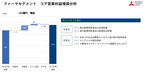 同セグメントでは、国内医療用医薬品で薬価改定の影響や、選定療養制度も含む後発品の浸食拡大などの影響を受けたものの、米国で発売した筋萎縮性側索硬化症(ALS)治療薬「RADICAVA ORS」の伸長、持続性GIP/GLP-1受容体作動薬「マンジャロ」、沈降精製百日せきジフテリア破傷風不活化ポリオヘモフィルスb型混合ワクチン「ゴービック水性懸濁注シリンジ」の順調な立ち上がりにより、売上高とコア営業利益ともに増加した。