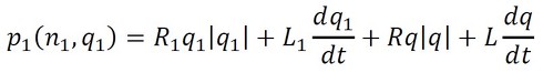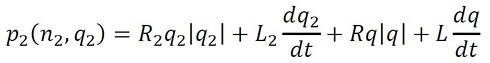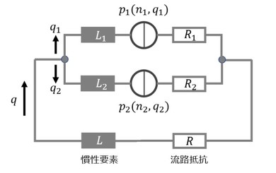 これは抵抗要素、慣性要素、ポンプ要素からなる流路網モデルとなる。各ポンプの特性をp1(n1,q1)、p2(n2,q2)とする。このとき、n1、n2は各ポンプの回転数、q1、q2は流量である。主配管を流れる流量をqとすると、分岐点における流量の連続条件(電流則)から、