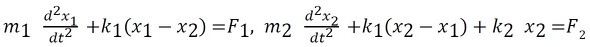 このとき、質点1の運動方程式と質点2の運動方程式は、