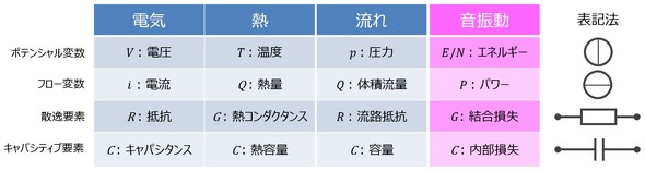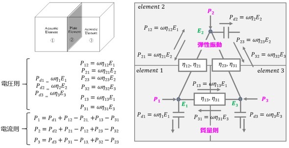 最後に、エネルギー法による音振動モデルのマトリクス表現を考える。音振動(エネルギー法)も図8に示すように電気、熱、流れと共通表現を有している。
