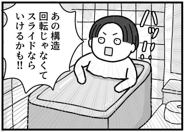 1コマ目からタナカくんの入浴シーンで失礼しました……。それはさておき、職場ではなかなか良い設計案が思い付かなかったのに、ふとした瞬間にアイデアがひらめくことってありますよね。さすがに夢の中だと朝になって忘れていそうですが(笑)。仕事に行き詰まったときこそ、「一度そこから離れてみる」というのが大切なのかもしれません。