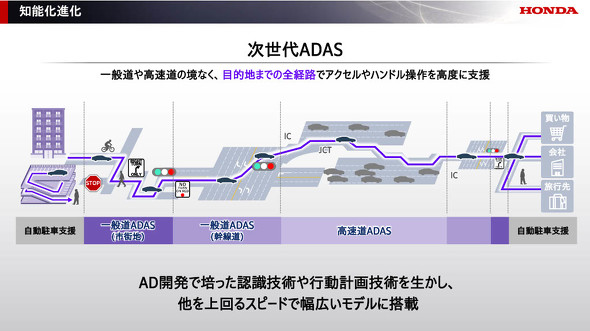 次世代ADASは、カーナビで目的地を設定すると、一般道/高速道路を問わず目的地までの全経路で運転操作を支援する。交通参加者が多様で交差点での右左折が頻繁に発生する市街地への対応では、自動運転システムの開発で培った認識技術や行動計画技術を生かす。