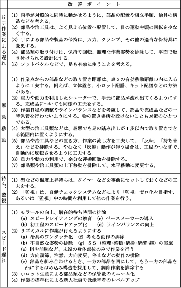 以下の表1〜表4で有効作業率の分析を行う際に役立つ表をまとめました。表1は有効動作分析表、表2は有効/無効作業の判断基準、表3は中量産/量産の場合の改善ポイント、表4は分析結果をまとめるための表になります。