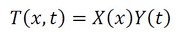 常とう手段として変数分離を使ってみましょう。温度を位置の関数と時間の関数の積として表すという考え方です。具体的には次のような式になります(式6)。