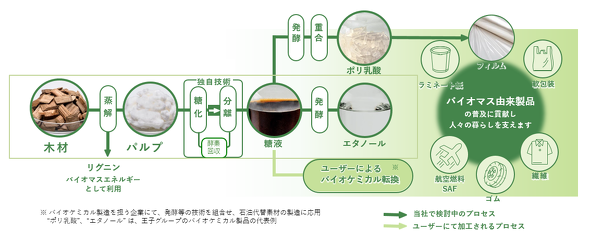 同社は現在、持続可能なバイオマスを原料に、微生物の代謝反応を活用し、化学素材、燃料、食品、医薬品などを製造する新たな産業モデル「バイオものづくり」の事業化を推進している。敷地面積が19万haに及ぶ社有林「王子の森」をはじめとする森林資源や製紙工場のインフラを活用し、バイオものづくり技術によって木質由来の糖液、バイオエタノール、ポリ乳酸を製造して、脱炭素社会の実現にも貢献する。