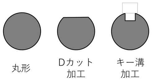 実際にモーターのカタログを見てみると、モーター軸の形状には「丸形」「キー溝加工」「Dカット加工」といった複数の種類(接続方式)があり、同時に接続する相手部品にもさまざまな接続方式がラインアップされています(場合によっては、設計で対応することもあります)(図3)。