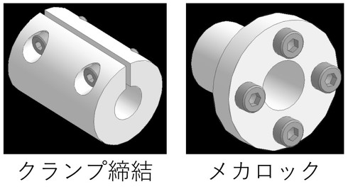 クランプ締結やメカロックを用いた軸締結を採用する場合には、モーター軸は丸形を選定するのが望ましいです。逆に、キー溝加工されたモーター軸を使用する場合はキーとキー溝付き部品を、Dカット加工されたモーター軸を使う場合はセットスクリュー(いもねじ)を用いた締結方式とするのが一般的です。