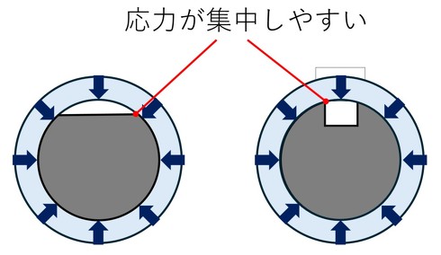 - 加工端部付近に応力が集中し、軸が破損する