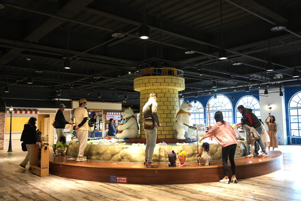 入り口を入ると、巨大な釣り体験アトラクションが目に飛び込んできます。誰しも子どものころに一度は遊んだことのある釣りゲーム玩具を大型化したもの……といえばイメージできるでしょうか。