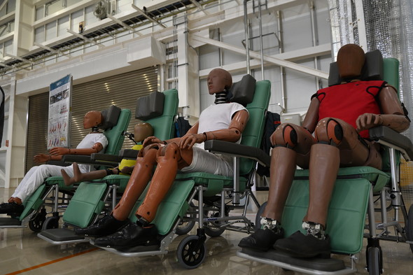 ダミー人形は計測器の一種だ。頭や首など後遺症につながりやすい部位を中心に内部に多くのセンサーが仕込まれており、エアバッグによって顔で受ける衝撃も計測できる。正しくセンサーが取り付けられていて正確なデータが取得できるか、関節の硬さなどを毎回同じセッティングができるか、社内でメンテナンスや校正をしながら取り扱い、前面衝突や側面衝突、後面衝突など実験の目的ごとに使い分ける。ダミー人形の素材に用いられるゴムの収縮の影響を少なくするため、実験前に小さなビニールハウスで一定の温度下に置く。