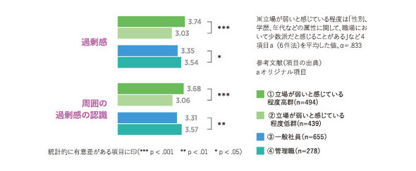 「強さを競う文化」の過剰感の違いを調べるため、職場で立場が弱いと感じている程度の高低2群で、過剰感や周囲の過剰感の認識の平均値を確認したところ、立場が弱いと感じている人の方が過剰感や周囲の過剰感の認識が統計的に有意に高い傾向が見られた。また、一般社員と管理職間で、過剰感の認識の違いを比較すると、管理職の方が統計的に有意に高かった。