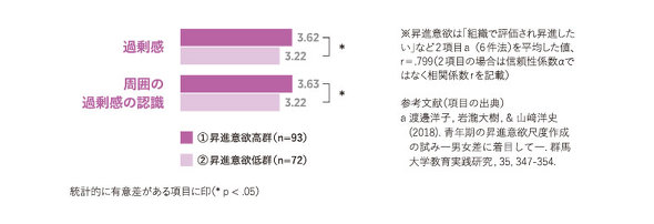 次に「総合職、地域総合職、一般職などの別がある」会社で働いている一般社員に対し、「昇進意欲」の高低2群で、過剰感、周囲の過剰感の認識の平均値の違いを確認した。その結果、昇進意欲高群は低群と比較して、どちらも統計的に有意に高かった。