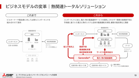 例えば、この新たなビジネスモデルが形になったものの1つとして熱関連トータルソリューションがある。従来はビルオーナーや製造業に対し、空調や給湯機器のコンポーネントを提供していただけだったが、これらで得られたデータを分析し、エネルギー需要の高精度予測と予測値に基づいた電力と熱のシステム全体の最適運転を実現する。これにより、顧客の脱炭素化に貢献する。