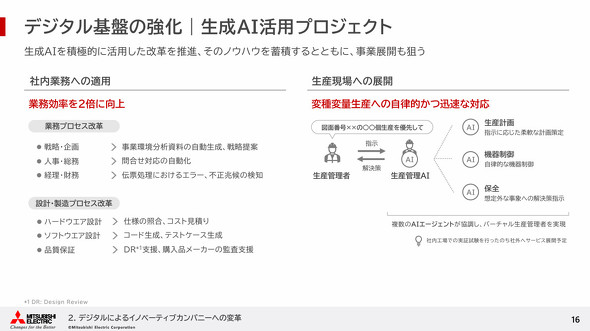 生成AIに関するプロジェクトも推進。「業務効率2倍」を目標に掲げ、社内公募により1000以上のアイデアを集めた。現在はこれらを基に60のプロジェクトを推進している。例えば、事務部門では、資料の自動生成や戦略立案、問い合わせ対応の自動化やエラー検知などで活用している。モノづくりに関わる領域では、設計部門で仕様の照合やコスト見積もり、コード生成やテストケース生成、デザインレビュー支援などで活用しているという。また、製造現場では、変種変量生産への自律的な対応を実現するために、複数のAIエージェントを組み合わせた「バーチャル生産管理者」を構築する取り組みを進めている。このバーチャル生産管理者については、社内工場で実証試験を行った後、社外へのサービス展開も計画しているという。