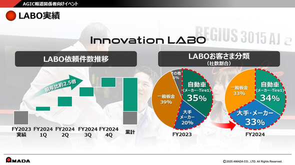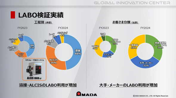 特に、さまざまな業種のユーザーによるInnovation LABOの活用が進んでいる。Innovation LABOでは仕切りで覆われたユーザー専用のスペースを9部屋設けており、ユーザーが抱えている課題に対してアマダの技術スタッフが共に加工検証し、要求品質などを確認する。2024年度の依頼件数は前年度と比較して2.5倍になった。2025年度は前年度比1.5倍の依頼件数を目指している。自動車メーカー、大手メーカーの割合は2023年度の55%から2024年度は67%へと広がっている。