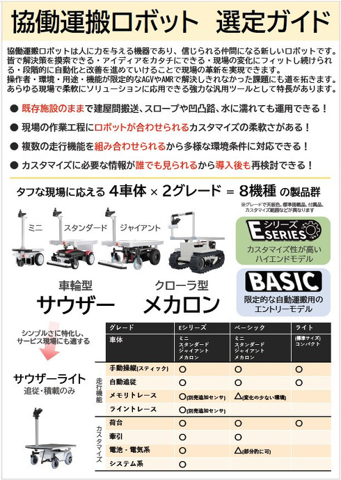 走行時の障害物検知といった基本機能に加え、段差や傾斜があっても安定して走行できる走破性を備えており、工場や倉庫だけでなく、空港や病院、鉄道の整備現場などにも導入が広がっている。また、荷台やけん引治具のカスタマイズが可能で、現場の運用変更にも柔軟に対応できる。