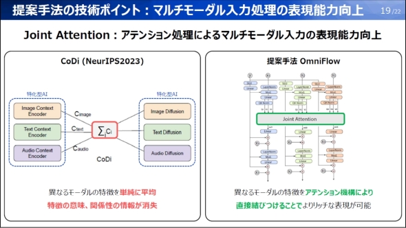 これらの工夫により、生成の過程で3つのモーダルの異なるデータ特徴を「アテンション機構」によって直接結び付けることで、従来手法のように各モーダルの特徴を平均するだけでは得られないデータ間の複雑な関係を学習できるようになった。
