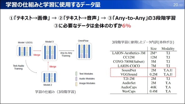 性能評価に用いたOmniFlowは以下のプロセスで作成した。まず、画像生成AIである「Stable Diffusion 3」を用いて「テキスト→画像」の学習を行い、この「テキスト→画像」のモデルのテキスト処理部に音声処理を加えて「テキスト→音」の学習を行った。その後、2つのモデルのテキスト処理部のパラメーターを平均して1つのテキスト処理部として扱うことで、テキストと画像、音の3モーダルの入出力が可能なモデルを作成した。最後に、このモデルに3つのモーダルが全てそろったペアデータを使って学習することで、Any-to-Anyに対応するマルチモーダル生成AIであるOmniFlowが得られる。OmniFlowを得る最後の学習プロセスに必要となる3つのモーダルが全てそろったペアデータの量は、ここまで全ての学習プロセスに用いたデータ量の6%に抑えられている。