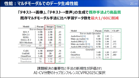 「OmniFlow」のマルチモーダルでのデータ生成性能。左側の表中の赤色の点線で示したImagesを基にUnidiff(2B)とOmniFlow(30M)の学習データ量を比較すると約60分の1になっている[クリックで拡大] 出所:パナソニックHD
