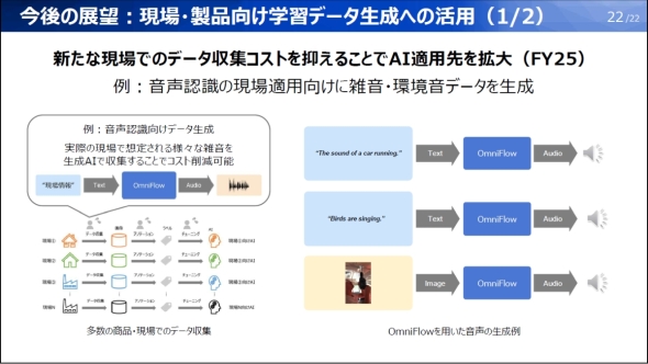 OmniFlowの用途としては、音声認識の現場適用向けに雑音/環境音データを生成するなど、新たな現場でのデータ収集コストを抑えてAI適用先を拡大することなどが検討されている。